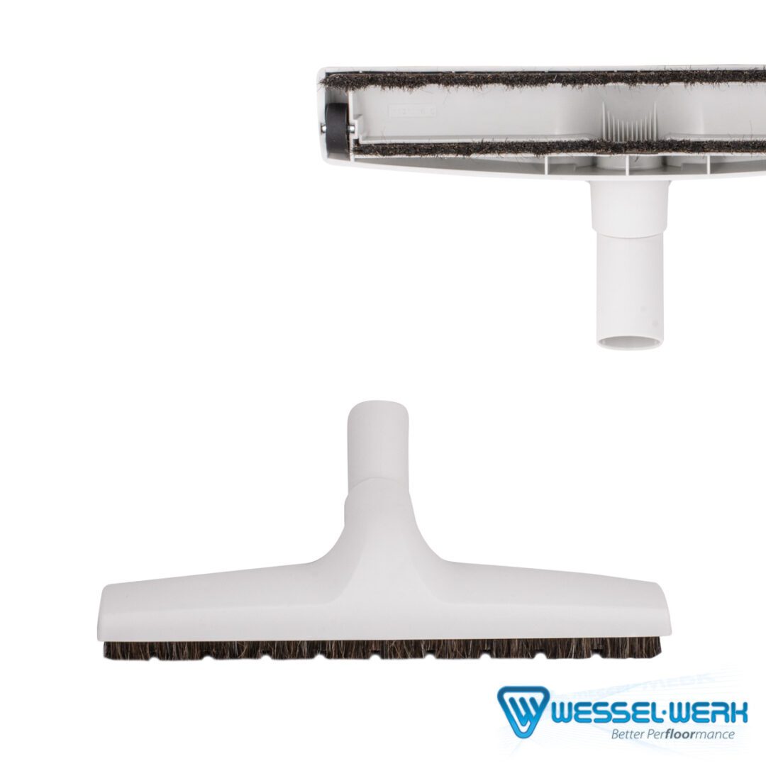 This attachment is designed to clean hard floors like wood, tile or laminate, which are surfaces that are best cleaned with soft bristles. The rubber wheels on each end help the brush glide smoothly.