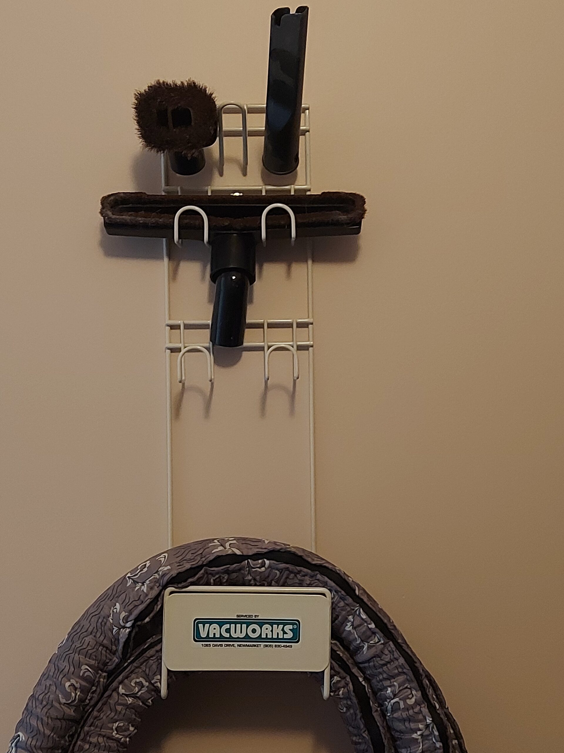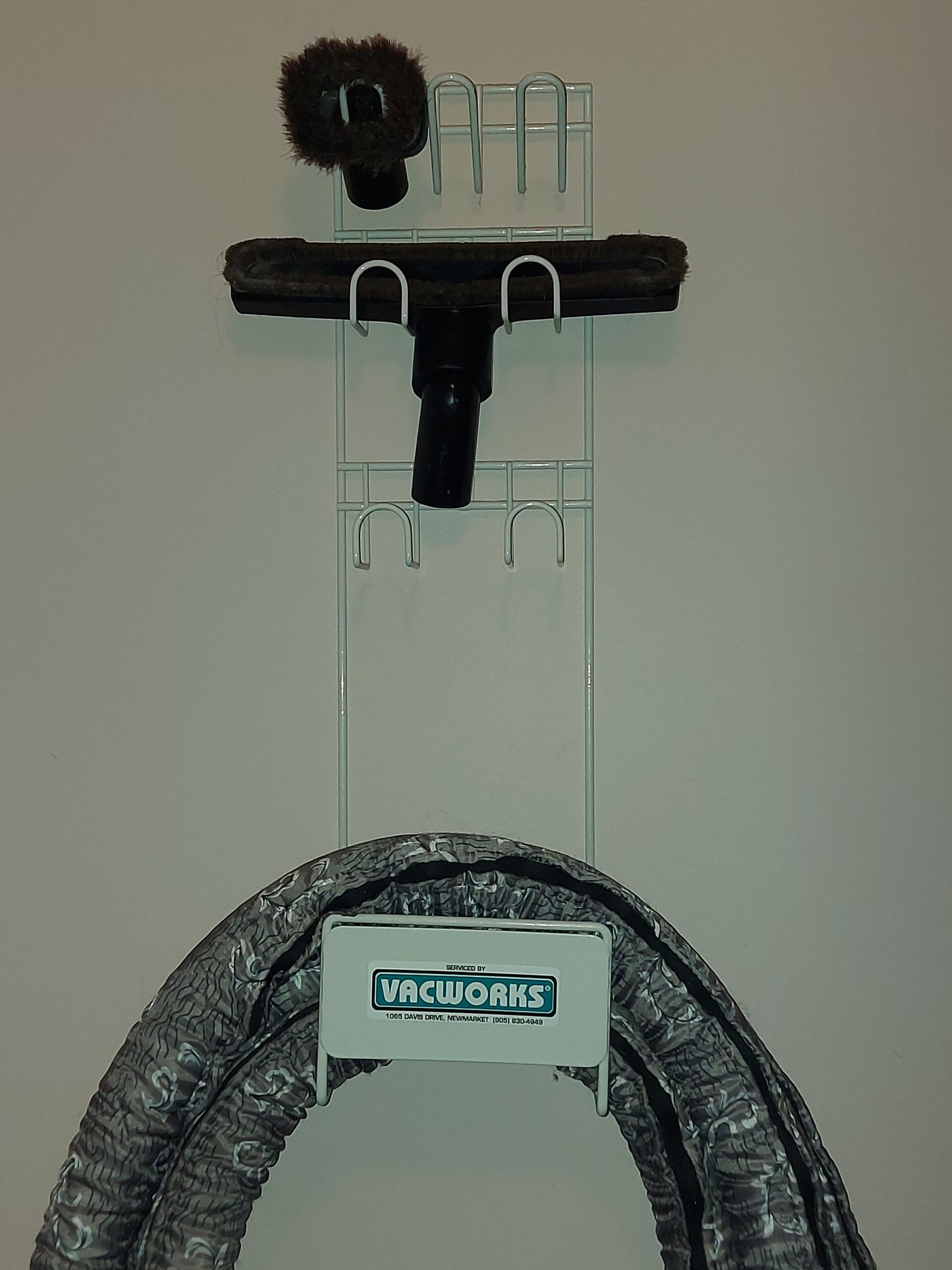Central vacuum hose hanger and multiple tool organizer. Perfect for keeping your hose, brushes and floor tools organized and always ready to use.